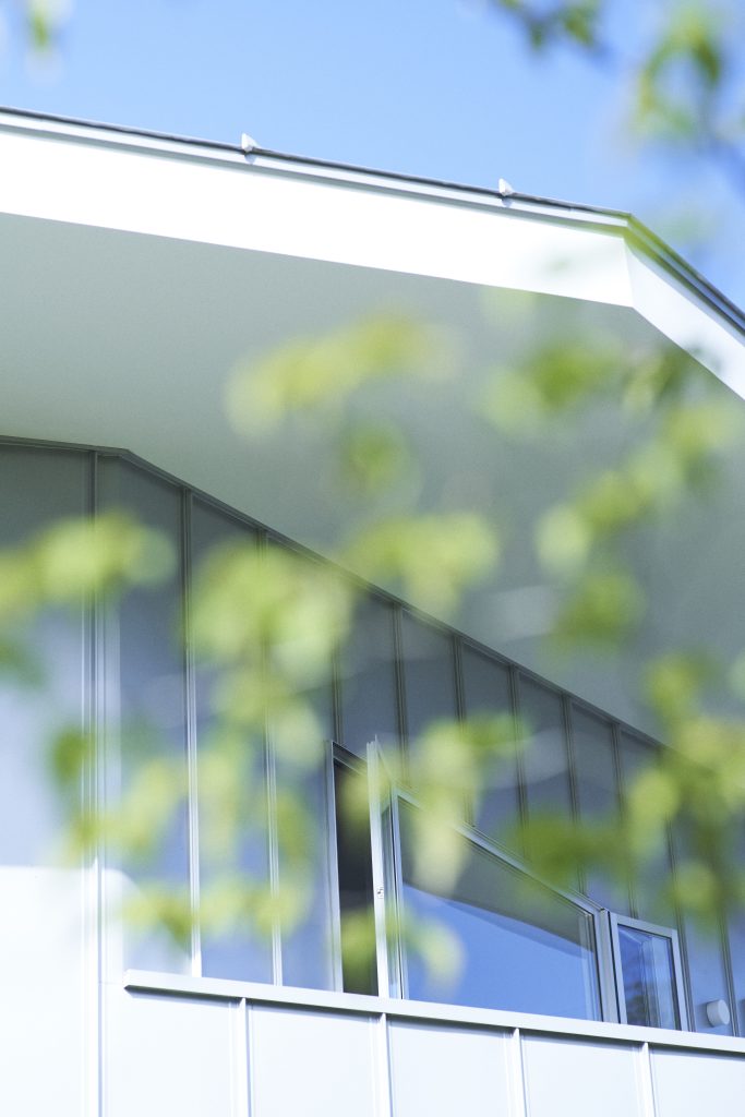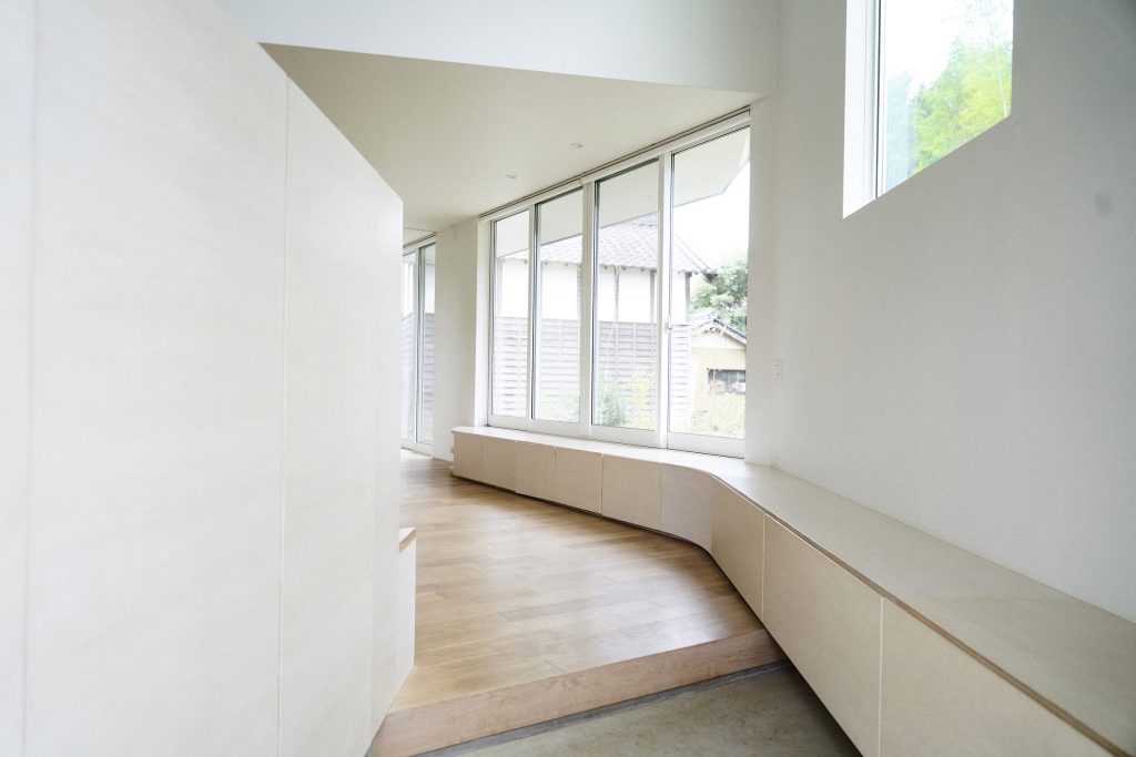 この建築は「創造性、ダイナミックな空間、連続性」をテーマに4人家族が快適に暮らすための家である。家族が日常的に様々な活動を共有できるように、玄関から直接リビング、キッチンへとシームレスに繋がる計画とした。空間の広がりを意識し、造作家具やキッチンカウンターは壁と一体型とし、異なる用途の境界が曖昧となるようにした。上下間を繋ぐ階段は、吹き抜けに面した2階の長い机へと続き、勉強読書エリアと変化していく。さらに、風や光の流れを考慮し、連続した空間の先に窓を設け内と外との繋がりを強化した。不要な要素を極力排除することで空間の連続性とダイナミズムが際立ち、住まい手の創造力を引き出す新たな住空間を追求した。